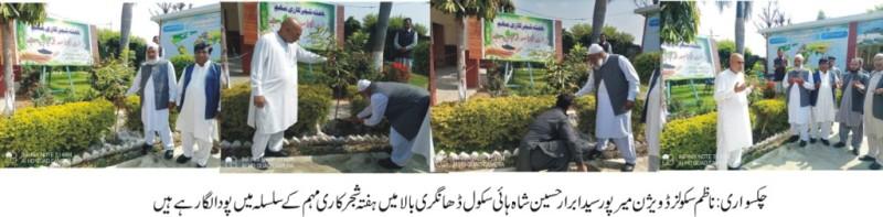 Chakswari (Pothwar.com, Allah Ditta Bismal, March 25, 2023)- Sahibzada Saida Ibrar Hussain Shah Divisional Director Elementary and Secondary School Division Mirpur visited Sufi Muhammad Yaqoob Shaheed Government High School Dhangri Bala Faizpur Sharif on arrival in the institution, the president of the institution, Chaudhry Muhammad Saeed Alam, management of the school and President of the committee Khalid Mahmood (R), president, teacher and staff welcomed them and planted saplings in the school.