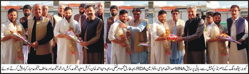 پی ٹی آئی یوتھ ونگ کے ناصر نذیر کو جیل سے رہائی ملنے پر پاکستان تحریک انصاف NA 57 کی مرکزی قیادت اور تحصیل کہوٹہ مقامی قیادت مبارکباد ینے گھر پہنچ گے،مالا ڈالی، گلدستے پیش کیے،تفصیل کے مطابق پاکستان تحریک انصاف یوتھ ونگ تحصیل کہوٹہ کے ناصر نذیرستی جن کو گذشتہ دنوں گر فتار کر لیا گیا جیل سے رہائی ملنے پر پی ٹی آئی قائدین مبارکباد دینے ان کے گھر پہنچ گے سابق MNAصداقت عباسی،چیئرمین RDAراجہ طارق محمود مرتضیٰ امیدوار برائے صوبائی اسمبلی پنجاب حلقہ پی پی سیون،صدر پی ٹی آئی تحصیل کہوٹہ راجہ وحید احمد خان، کرنل سعید جنجوعہ، کرنل ارشد جنجوعہ،راجہ واحد سمندر،عاطف جنجوعہ اور دیگر نے ان کو مبارکباد پیش کی اس موقع پر انہوں نے کہا کہ یوتھ پارٹی کا قیمتی اثاثہ ہیں اور خان کے سپاہی ہیں جیلیں اور گرفتاریاں ہمارے حوصلے پست نہیں کر سکتے۔
