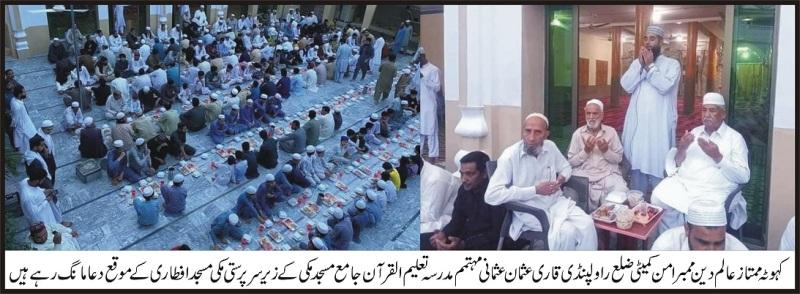 ممتاز عالم دین ممبر امن کمیٹی ضلع راولپنڈی قاری عثمان عثمانی مہتمم مدرسہ تعلیم القرآن جامع مسجد مکی کے زیر سرپرستی مکی مسجد کے نوجوانوں اور طالب علموں کی جانب سے سیاسی سماجی مذہبی شخصیات اہل محلہ نمازیوں کے اعزاز میں پرتکلف افطاری کا اہتمام کیا گیا اس موقع پر سینئر قانون دان راجہ محمد ستار اللہ ایڈووکیٹ سپریم کورٹ، نوجوان قانون دان ارسلان اصغر کیانی ایڈووکیٹ، سول ڈیفنس کے اہلکار ملک اکرام سمیت بڑی تعداد میں سیاسی و سماجی مذہبی شخصیات نمازیوں اہل محلہ نے شرکت کی جامع مسجد مکی کے طالب علموں نوجوانوں نے افطار کا اہتمام خود کیا اور مختلف پکوانوں سے دسترخوان کو سجھایا اس موقع پر مولانا قاری عثمان عثمانی نے بہترین افطار اہتمام پر طالب علموں نوجوانون کو سراہا جب آئے تمام مہمانان گرامی کا شکریہ ادا کیا اخر میں قاری عثمان عثمانی نے تمام عالم اسلام کے لیے اور نبی پاکؐ کی ساری امت کے مرحومین مرد و زن کے ایصال ثواب اور پاکستان اور اس کی سرحدوں کے محافظوں کے لیے بھی خصوصی دعا کی۔