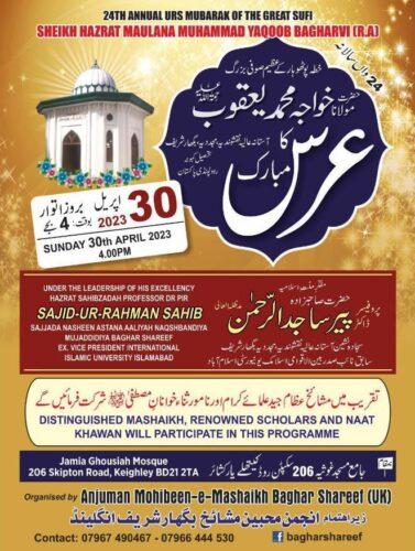 The first urs mubarak will be of Hazrat Khwaja Mawlana Muhammad Yaqoob Bagharvi, which will be held on Sunday, April 30, at 4 pm in the Ghousia Masjid on Skipton Road, Keighley.