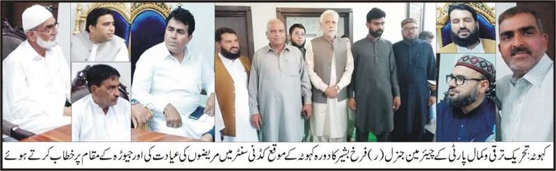 تحریک ترقی و کمال پارٹی کے چیئرمین جنرل(ر) فرخ بشیرکا غلام ربانی قریشی فری ڈیلائیسز سنٹر کہوٹہ کادورہ،مریضوں کی عیادت کی جبکہ جیوڑہ کے مقام پرمعززین علاقہ سے خطاب بھی کیا تفصیل کے مطابق گذشتہ روزتحریک ترقی و کمال پارٹی کے چیئرمین جنرل(ر) فرخ بشیرنے ہمراہ روزنامہ نوائے اسلام آبادکے سینئرصحافی صطفٰی کھٹڑکے کہوٹہ کا دورہ کیا اور کہوٹہ شہر میں قائم غلام ربانی قریشی فری ڈائلیسس کڈنی سنٹرکادورہ مریضوں کی عیادت کی اور صحت یابی کے لیے دعا کی،کڈنی سنٹر کے علاوہ بلقیس ربانی ڈائگناسٹک سنٹر،وحید ربانی قریشی لیب،الفتح وومن وکیشنل سنٹر،ماسٹر بشیر قریشی کمپیورٹر سنٹر کا دورہ کیا اس موقع پرانہوں نے چیئر مین غلام ربانی قریشی ویلفئیر فاؤنڈیشن آصف ربانی قریشی کی کوششوں کاوشوں کو بھی خراج تحسین پیش کی انہوں نے جیوڑہ کے مقام پر معروف تعلیم دوست شخصیت پرنسپل محمد فاروق قریشی کی رہائش گاہ پر بھی گے اور وہاں پر معززین علاقہ سے خطاب کیااس موقع پر کثیر تعداد میں اہلیان علاقہ موجود تھے۔