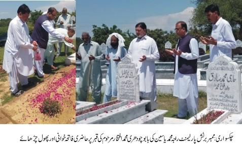 چکسواری(نمائندہ پوٹھوار ڈاٹ کوم، ،اللہ دتہ بسمل ,13،مئی,2023)—ممبربرطانوی پارلیمنٹ راجہ محمد یاسین نے یونین کونسل فیض پورشریف کادورہ کیا انہوں نے بوعہ ڈھوک کیپٹن محمدسلیم جاکرچودھری محمداعجاز کے کزن بابو چودھری محمدافتخار کی وفات پرسوگواران کے ساتھ اظہارتعزیت کیامرحوم کے لئے دعائے مغٖفرت اورلواحقین کے لئے صبرجمیل کی دعاکی انہوں نے بابو چودھری محمدافتخار مرحوم کی قبرپرحاضری دی فاتحہ خوانی کی انہوں نے بابو چودھری محمدافتخار مرحوم کوان کی شاندار سیاسی سماجی خدمات پرخراج عقیدت پیش کیا اورکہاکہ بابو چودھری محمدافتخار مرحوم کی وفات پر سے جوخلاء پیداہوا وہ مدتوں پرنہیں ہوگا ان کی وفات سے ہم ایک بہترین دوست مخلص راہنما اوربیڈفورڈ برطانیہ اوربوعہ کے عوام ایک ہمدرد شخصیت سے محروم ہوگئے ہیں ان کی بیڈفورڈ برطانیہ اوربوعہ کی کمیونٹی کے لئے شاندار خدمات ہیں جومدتوں یادرکھی جائیں گی بابو چودھری محمدافتخار مرحو م کے کزن چودھری محمداعجاز اوربھانجے نثار احمدخان اسرار احمدخان اورمرحوم کے فرزندان نے راجہ محمدیاسین ممبربرٹش پارلیمنٹ کاشکریہ اداکیاکہ انہوں نے ہمارے ساتھ ہمدردی کااظہار کیاغم میں برابر کے شریک ہوئے ہمارے غم کواپناغم سمجھا اوراپنے دوست کویادرکھا