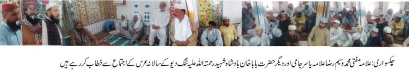 چکسواری(نمائندہ پوٹھوار ڈاٹ کوم، ،اللہ دتہ بسمل ,13،مئی,2023)—علامہ مفتی محمدوسیم رضا چیئرمین سنی علماء ومشائخ کونسل آزادکشمیر نے کہاہے کہ اولیائے کرام کے مزارات رشدوہدایت کے مراکز ہیں اورہرعام وخاص کے لئے مرجع خلائق ہیں اہل دل لوگوں کے دلوں پرحکومت کرتے ہیں ان کاسکہ دلوں پرچلتاہے فقروسادگی کانمونے ہوتے ہیں مگرمگران کے حضورشاہان وقت عقیدت وارادت کے پھول لے کرہوتے ہیں جب انسان کے دل ودماغ پرسیاہی چھاجاتی ہے جب ان کے اعمال پرغیرت روتی ہے اورایمان ماتم کرتاہے جب سکون عنقاہوجاتاہے جب پریشانیاں دل کے سکون کومتزلزل کردیتی ہیں جب مصائب کمرتوڑدیتے ہیں تب ا ہل دل کے درباروں پرحاضری اوران کے مزارات پرسلام ودعاسے اطمینان وسکون کی دولت ملتی ہے افسردہ پیشانیاں ستاروں کی طرح دمک اٹھتی ہیں پرپریشان دل شگفتہ ہوجاتے ہیں اوربجھی شمعیں روشن ہوجاتی ہیں انہوں نے ان خیالات کااظہار حضر ت بابا خان بادشاہ شہیدرحمتہ اللہ علیہ تنگ دیو یونین کونسل فیض پورشریف کے سالانہ عرس مبار ک کے اجتماع سے خطاب کرتے ہوئے کیاہے عرس کے اجتماع سے دارلعلوم اسلامیہ شرقیہ چکسواری کے مدرس وامام جامع مسجدشرقی چکسواری مولانا یاسرجامی آف کوٹلی نے بھی خطاب کیا عرس کے اجتماع کی صدارت دربارعالیہ حضر ت باباخان بادشاہ رحمتہ اللہ علیہ کے گدی نشین حاجی چودھری محمدسوار خان سابق ممبرضلع کونسل میرپور نے کی عرس کی تقریب کے انتظام وانصرام کی نگرانی چودھر ی خوشنود ممبرضلع کونسل چودھری محمدرئیس کونسلر چودھری فریداحمدنے کی عرس کے اجتماع میں سیاسی سماجی کاروباری شخصیات سمیت زندگی کے تمام شعبوں سے تعلق رکھنے والے افراد کی ایک بڑی تعداد میں شرکت کی عرس مبارک کی تقریب کاآغاز تلاوت کلام پاک سے کیاگیامقامی مسجد کے امام حافظ قاری محمدصہیب اکبر نے تلاوت کلام پاک کی سعادت حاصل کی مقامی نعت خوان حضرات نے ہدیہ نعت پیش کرنے کاشرف حاصل کیاقاری حافظ محمدصہیب اکبر نے ختم شریف پڑھا مولانامفتی محمدوسیم رضا نے دعاکرائی