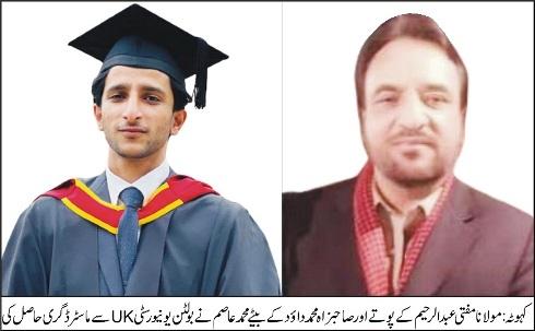 مولانا مفتی عبدالرحیم صاحب(جامعہ رحمیہ کہوٹہ)کے پوتے اور صاحبزاہ محمد داؤد کے بیٹے محمد عاصم نے بولٹن یونیورسٹی سے ماسٹر ڈگری حاصل کر لی