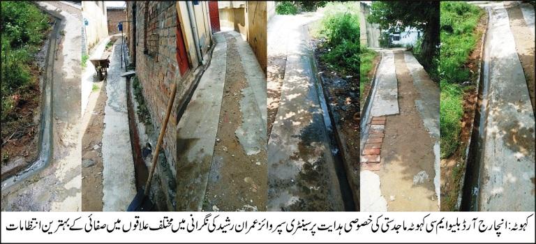 انچارج آر ڈبلیو ایم سی کہوٹہ ماجد ستی کی خصوصی ہدایت پرسینٹری سپروائز عمران رشیدکی نگرانی میں مختلف علاقوں میں صفائی کے بہترین انتظامات