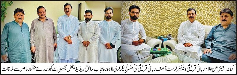 چیئرمین غلام ربانی قریشی ویلفیئر ٹرسٹ آصف ربانی قریشی کی کمشنر / سیکرٹری لاہور پنجاب سابق ریذیڈینشل مجسٹریٹ کہوٹہ رائے منظور ناصر سے ملاقات