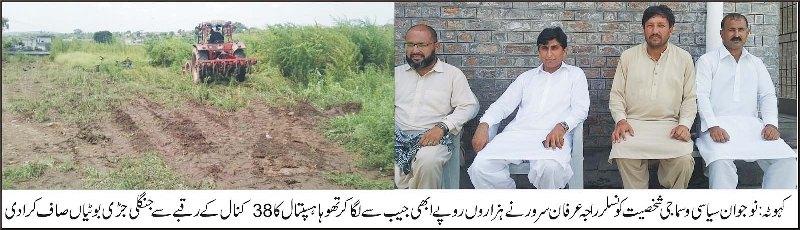 کونسلر راجہ عرفان سرور اپنی ذاتی جیب سے ہزاروں روپے لگا کر تھوہا ہسپتال کا38کنال کے رقبے سے جنگلی جڑی بوٹیاں صاف کرا دی