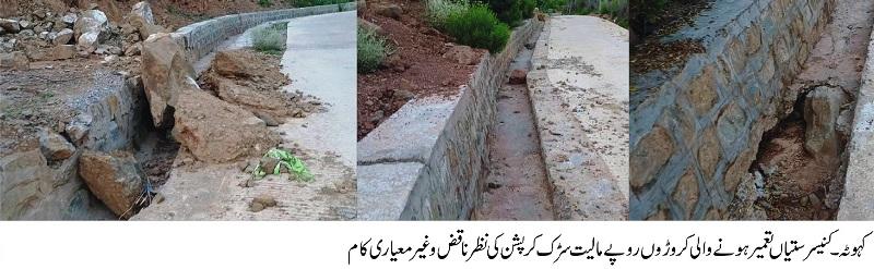 یونین کونسل ہوتھلہ کنیسر ستیاں کروڑوں روپے لاگت سے تقرخبا ڈیڑھ کلو میٹر سڑک کی تعمیر ناقص میٹیریل کا استعمال منصوبہ کرپشن کی نظر ٹھیکیدار اور محکمہ کی ملی بھگت سے غیر معیاری کام عوام سراپا احتجاج سڑک کے شولڈر، نالا اور سیفٹی وال ٹوٹ پھوٹ کا شکار ہو گئی منصوبہ مکمل ہونے سے پہلے ہی ٹھیکدار اور محکمے کی کرپشن کے گن گانے لگا کام شروع ہونے کے وقت عوام علاقہ نے احتجاج بھی کیا اسکے باوجود غیر معیاری کام کیا گیا تحریک کہوٹین یوتھ کے امیر راجہ ناصر دیگر ٹیم اور عوام علاقہ نے اس موقع پر تعمیر شدہ سڑک کے مقام پر جا کر کام کا معائنہ کیا سڑک میں غیر معیاری کام ناقص مٹریل کا استعمال کیا گیا نہ تو سڑک کے کناروں پر شولڈر رہے نالا ٹوٹ گیا جبکہ سیفٹی وال بھی ٹوٹ پھوٹ کا شکارعوام علاقہ تحریک کہوٹین یوتھ نے مطالبہ کیا کہ لوکل گورنمنٹ کے افسران ٹھیکدار کے خلاف سخت کاروائی کی جائے معاملے کی انکوائری کی جائے