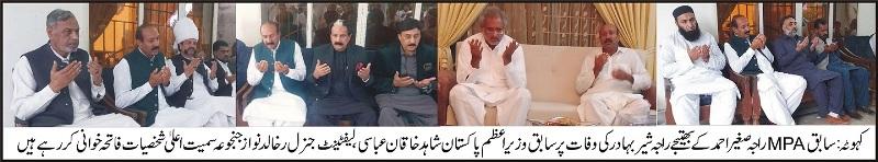 سابق ایم پی اے راجہ صغیر احمد کے بھتیجے راجہ شیر بہادر کی وفات پر سابق وزیر اعظم پاکستان شاہد خاقان عباسی سمیت اعلیٰ شخصیات کا اظہار تعزیت،گذشتہ روزسابق وزیر اعظم پاکستان شاہد خاقان عباسی،لیفٹینٹ جنرل ر خالد نواز جنجوعہ،پیر جمال شاہ آف پشاور،محمود خان بنگش چیف آف آل پختون، ملک صفدر اعوان چیف آف آل اعوان پاکستان،سابق وزیر ریاست آزاد کشمیر راجہ صدیق،سینیٹر چوہدری تنویر خان،ڈائریکٹر ایف آئی اے محمود ستی،نائب صدر مسلم لیگ ن صوبہ پنجاب حافظ عثمان عباسی اٹارنی جنرل اسلام آباد عقیل ستی، چیئرمین آئیسکوسابق ایم پی اے قمرالسلام،راجہ شوکت اقبال جنجوعہ، ڈویژنل صدر ن لیگ ملک ابرار، سابق ایم پی اے شوکت محمود بھٹی،سی،ای،او بلیو ورلڈ سٹی و امیدوار برائے قومی اسمبلی مسلم لیگ ن چوہدری نعیم اعجاز،سابق امیدوار برائے قومی اسمبلی چوہدری عظیم،سابق ناظم یوسی مٹور سردار الیاس اختر جنجوعہ، سردار شعور اختر جنجوعہ،سابق چئیرمین دوبیرن خورد راجہ ظفر بگھاروی اور دیگر سیاسی وسماجی شخصیات نے مٹور سابق ایم پی اے راجہ صغیر احمدکی رہائش گاہ پر جاکر ان دلی تعزیت کی اور مرحوم کے ایصال ثواب کے لیے فاتحہ خوانی کی۔