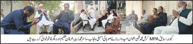 سابق ممبر صوبائی اسمبلی پنجاب و چیئرمین پی اینڈ ڈی کرنل (ر) محمد شبیر اعوان کا تحصیل کہوٹہ کا دورہ، ووٹروں، سپورٹروں، دوستوں سے ملاقاتیں،آمدہ الیکشن کے حوالے سے گفتگو، جبکہ فوتگی والے گھروں میں بھی حاضری دی مرحومین کے ایصال ثواب کے لیے دعا کی اور لواحقین سے اظہار تعزیت کیا،تفصیل کے مطابق گذشتہ روزپی ٹی آئی کے سینئر رہنماء سابق ممبر صوبائی اسمبلی پنجاب و چیئرمین پی اینڈ ڈی کرنل (ر) محمد شبیر اعوان امیدوار برائے صوبائی اسمبلی پنجاب حلقہ پی پی سیون نے تحصیل کہوٹہ کادورہ کیا انہوں نے کہوٹہ گلشن رضا کالونی والے شاہد محمود حال مقیم امریکہ ان کے والد محترم اللہ دتہ کی وفات پر ان کے لواحقین سے اظہار تعزیت کے بعد فاتحہ خوانی کی اس موقع پر ماسٹر محمد زبیر، عرفان عظیم اعوان، برکات بٹ اورنوجوان کاروباری شخصیت عدیل افضل بھی موجود تھے انہوں نے کہوٹہ شہر میں ہی معروف کاروباری شخصیت قاضی اسحاق سیکو واج والے کی وفات پر ان کے لواحقین سے اظہار تعزیت کے بعد فاتحہ خوانی کی اس موقع پر ماسٹر محمد زبیر اور عدیل افضل بھی موجود تھے کرنل محمد شبیر اعوان نے پنجاڑ کھوئیاں والے نوید عباسی کے بھائی تبسم شہید کے درجات بلندی کے لیے دعا کی تبسم شہید وانا کے مقام پر دہشتگردوں سے لڑتے ہویے اپنے وطن کی حرمت پر جان فدا کر دی تھی کرنل محمد شبیر اعوان نے شہید کو شاندار الفاظ میں خراج تحسین پیش کی اس موقع پر ماسٹر محمد زبیر اور عدیل افضل بھی موجود تھے۔