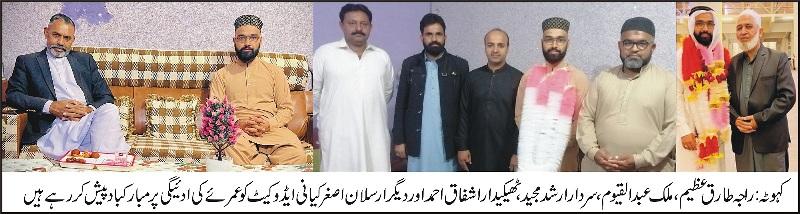 تحصیل کہوٹہ کے سینئر بزرگ صحافی حاجی اصغر حسین کیانی کا صاحبزادہ نوجوان قانون دان، معروف صحافی و اینکر پرسن ارسلان اصغر کیانی ایڈوکیٹ عمرئے کی سعادت حاصل کرنے کے بعد وطن پہنچ آئے اہرپورٹ پر ان کے والدین، خاندان کے دیگر افراد اور دوستوں نے پرتباک استقبال کیا ہم اپنے بھائی ارسلان اصغر کیانی ایڈوکیٹ کو عمرئے کی سعادت حاصل کرنے پر دلی مبارکباد پیش کرتے ہیں،گذشتہ روزمعروف سیاسی وسماجی شخصیات فرزند کہوٹہ راجہ طارق عظیم امیدوار برائے قومی اسمبلی حلقہ این اے اکاون، جماعت اسلامی کی نوجوان سیاسی شخصیت ملک عبد القیوم،پی ٹی آئی کے سردار ارشد مجید،ٹھیکیدار اشفاق احمد، صحافی کبیر احمد جنجوعہ نے ان کی رہائش گاہ جا کر ان کو عمرئے کی مبارکبا دپیش کی،ارسلان اصغر کیانی ایڈوکیٹ نے اپنے معزز مہمانوں کومدینے پاک کی کجھوریں اور زم زم پیش کیا،