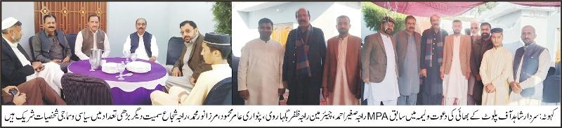 سردار شاہد آف پلوٹ کا چھوٹا بھائی سردار احمد رشتہ ازواج میں منسلک دعوت میں بڑھی تعداد میں سیاسی وسماجی شخصیات کی شرکت،سردار شاہد آف پلوٹ کے چھوٹے بھائی سردار احمدکی دعوت ولیمہ کی تقریب ان کے آبائی گاؤں پلوٹ یوسی مٹور میں منعقدہوئی دعوت ولیمہ میں سابق ایم پی اے راجہ صغیر احمد آف مٹور،سابق چیئرمین یوسی دوبیر ن راجہ ظفر بگہاروی،سابق چیئرمین یوسی کھڈیوٹ سجاد ستی،راجہ ثقلین ممیام، راجہ شجاع جنجوعہ ممیام،پٹواری ملک امام بخشش،پٹواری عامر محمود،مرزا نور محمد آف دڑیوٹ وارث،سابق ناہب ناظم یوسی بیور سردار شفاقت حسین، سردار ایم رضاء، کونسلر راجہ سجاد بیور، حاجی منشی ریاض بیور، کونسلر راجہ عباس پپو، کونسلر راجہ گلزار احمد گلزاری،کونسلر راجہ عرفان سرور (چیئرمین سرور گروپ) عاشر جنجوعہ تھوہا راجگان،راجہ طحہ عباس جنجوعہ،ٹھیکیدار آفتاب کیانی،شیخ جاوید نار ہ،ماجد جنجوعہ دڑیوٹ وارث، سینئر صحافی ساجد جنجوعہ،صحافی پرویز اقبال مواڑہ، صحافی کبیر احمد جنجوعہ سمیت بڑھی تعداد میں سیاسی وسماجی شخصیات نے شرکت کی۔