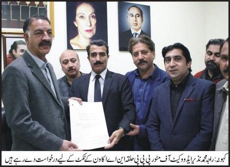 این اے 51 کی سیاست میں بڑی تبدیلی معروف وکیل سابق کوآرڈینیٹر ٹو چیرمین پارلیمانی کمیٹی برائے متاثرہ ملازمین و سیکرٹری اطلاعات پاکستان پیپلز پارٹی راولپنڈی ڈوثرن راجہ محمد نذیر ایڈووکیٹ آف مٹور بھی میدان میں آ گے این اے 51 مری کہوٹہ سے الیکشن لڑنے کا فیصلہ، راجہ نذیر ایڈووکیٹ نے پارٹی ٹکٹ کے لیے بظابطہ درخواست پپپلز سیکرٹریٹ میں جمع کرا دی، راجہ نذیر ایڈووکیٹ نے کہا کہ شاہد خاقان عباسی اور صداقت عباسی نے مشکل وقت میں حلقے کے عوام کو چھوڑا ھے انھوں نے کہا حلقے کہ عوام کو تنہا چھوڑیں گے اور نہ ہی کسی امپورٹیڈ امیدوار کے حوالے کریں گے، راجہ نذیر ایڈووکیٹ نے کہا کہ درالحکومت کے سنگم میں ھو نے کے باوجود حلقہ این اے 51 کے عوام بنیادی سہولیات سے محروم ہیں،پی پی پی رہنماء راجہ نذیر ایڈووکیٹ نے کہا اگر پارٹی نے ان کو ٹکٹ دیا تو علاقے کی تعمیر و ترقی کے لیے دن رات ایک کرتے ھوے حلقہ این اے 51 کو ماڈل حلقہ بناہیں گے۔