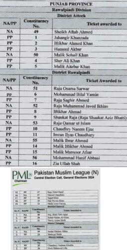 مسلم لیگ ن نے قومی اسمبلی کے حلقہ این اے 51،52،53 پی پی 6,7,8,9,10 کے امیدواروں کو ٹکٹ جاری