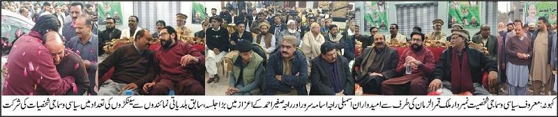 معروف سیاسی و سماجی شخصیت نمبردار ملک قمر الزمان کی طرف سے امیدواران اسمبلی راجہ اسامہ سرور اور راجہ صغیر احمد کے اعزاز میں بڑا جلسہ