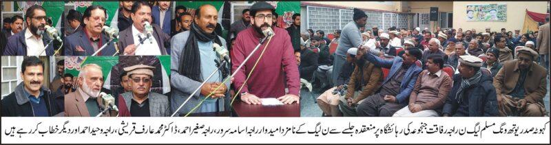 صدر یوتھ ونگ مسلم لیگ ن راجہ رفاقت جنجوعہ کی رہائشگاہ پر مسلم لیگ ن کے نامزد امیدواران برائے این اے 51 راجہ اسامہ اشفاق سرور اور امیدوار برائے ممبر صوبائی اسمبلی PP7 راجہ صغیر احمد کے اعزاز میں کارنر میٹنگ کا انعقاد