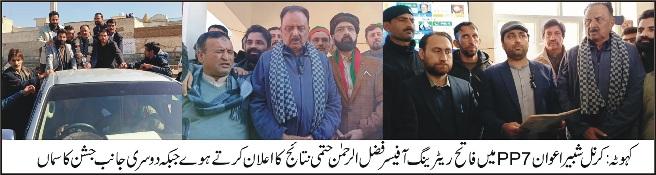 حلقہ PP7 کے نتائج کا حتمی اعلان کر دیا گیا PTI کے حمایت یافتہ امیدوار کرنل شبیر اعوان ہزار6سے زاہد کی لیڈ سے پہلے نمبر پر مسلم لیگ ن کے نامزد امیدوارراجہ صغیراحمد دوسرے نمبر پر، پی ٹی آئی کارکنوں، ورکروں کا جشن عمران خان زندہ باد، سب کا جگری سب کا یار قیدی نمبر804کے فلک شگاف نعرے،الیکشن کا حتمی نتائج کا اعلان ریٹرنگ آفیسرفضل الرحمن نے کیا کہوٹہ میں PTI ورکرز کارکنان کا جشن نعرے بازی فتح کا جشن منایا کہوٹہ بازار میں ریلی نکالی،تاجروں نے کرنل محمد شبیر اعوان کا پر تباک استقبال کیا 8 فروری کو پولنگ کا عمل جاری رہا لیکن نتائج لیٹ موصول ہوئے حتمی نتیجہ 9 فروری صبح 11 بجے کے قریب کیا گیا اس حلقہ سے پی ٹی آئی کے حمایت یافتہ آزاد امیدوار کرنل شبیر اعوان اور مسلم لیگ ن کے راجہ صغیر احمد کے مابین کانٹے کا مقابلہ ہوا جبکہ کرنل شبیر نے 72898 ووٹ لیکر پہلے نمبر پر راجہ صغیر احمد 66338 دوے کے ساتھ دوسرے نمبر پر رہے اسی طرح کرین پارٹی کے کرنل وسیم احمد جنجوعہ 22095 ووٹ کے ساتھ تیسرے نمبرپر، راجہ ندیم احمد آزاد امیدوار 8952 ووٹ کے ساتھ چوتھے اور PPP کے چوہدری ظہیر 6870 کیساتھ پانچویں پوزیشن میں رہے یاد رہے کہ نتائج لیٹ ہونے کے باعث ورکرز کارکنان میں دھاندھلی کی تشویش پائی گئی جبکہ مسلم لیگ ن کے راجہ صغیر احمد کی ہار میں اہم کردار راجہ ندیم احمد کا رہا جنکا تعلق مسلم لیگ ن سے تھا اور کلر سیداں میں راجہ صغیر کا ووٹ بریک کیا جیت کی اطلاع کے بعد نو منتخب ایم پی اے کرنل شبیر اعوان کی قیادت میں PTI کے ورکرز کارکنان نے ریلی نکالی اور جشن منایااس موقع پر سابق ناظم راجہ الطاف حسین، نوجوان قیادت راجہ عمران ستار جنجوعہ ملک کلیم حسین اعوان چیئرمین مرید اعوان ویلفیئر سوسائٹی(رجسٹرڈ)، عدیل افضل، ملک شاہ زیب اعوان، چوہدری واحد آف پیکاں،ملک صوبیدار فاروق دھپری،طاہر ارشاد،ملک جمیل اعوان دھپری،ملک اخلاص، ملک جہانذیب،سردار ارشد مجید، ظفر انقلابی، عنائت اللہ ستی، نوید ستی کلیال، عابد کیانی کلیال،انعام کیانی کلیال،فیصل جرال، فیضان خانزادہ سمیت ہزاروں کارکنان، ورکنان موجود تھے۔