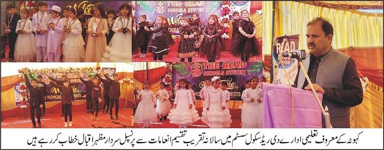 کہوٹہ کے معروف تعلیمی ادارے دی ریڈ سکول سسٹم میں سالانہ تقریب تقسیم انعامات، سیاسی وسماجی شخصیات کی شرکت، پوزیشن ہولڈر بچوں اور بچیوں میں انعامات تقسیم کیے،دی ریڈ سکول سسٹم کے پرنسپل معروف مائر تعلیم سردار مظہر نے بچوں کے والدین، تمام سیاسی،سماجی و علمی شخصیات کا شکریہ ادا کیااور اپنے خطاب میں کہا کہ میں تمام طلباو طالبات کو مبارکباد پیش کرتا ہوں جنہوں نے نمائیاں پوزیشنیں حاصل کیں اور تقاریر پیش کیں انہوں نے اپنے خطاب میں کہا کہ تعلیم ایک ایسا معاشرتی عمل ہے، جسکے معنی ہیں سکھانا یا رہنمائی کرنا چونکہ تعلیم کے ذریعہ انسان کی مخفی اور فطری صلاحیتوں کو ابھار کر ان سے کام لیا جاتا ہے۔ لہٰذا تعلیم ہر ذی شعور انسان چاہے وہ امیر ہو یا غریب، مرد ہو یا عورت کی بنیادی ضروریات میں سے ایک ہے انہوں نے مزید کہا کہ اگر دیکھا جائے تو انسان اور حیوان میں فرق تعلیم ہی کی بدولت ہے بلکہ کسی بھی قوم یا معاشرے کی ترقی کی ضامن ہے اور یہی تعلیم قوموں کی ترقی اور زوال کی وجہ بنتی ہے درحقیقت تعلیم وہ زیور ہے جو انسان کا کردار سنوراتی ہے۔ دنیا میں ہر چیز بانٹنے سے گھٹتی ہے مگر تعلیم ایک ایسی دولت ہے جو بانٹنے سے گھٹتی نہیں بلکہ بڑھ جاتی ہے۔ اسلام میں تعلیم کے حصول کو فرض کا درجہ دے کر اس کی اہمیت کو واضح کیا گیا ہے،آخر میں انہوں نے تمام شر کاء کا شکر یہ ادا کیا اور عالم اسلام اور پاکستان کی سلامتی کے لیے خصوصی دعا کی گئی۔