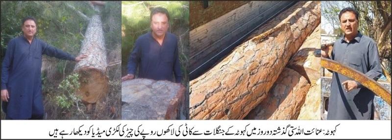 عنائت اللہ ستی کی اطلاع پر سرکاری جنگل سے کاٹی گی لاکھوں روپے مالیت کی سبز چیڑمحکمہ جنگلات پنجاڑ بلاک نے پکڑلی، چیف کنزیویٹرمحکمہ جنگلات شیخ ثاقب، ڈی ایف او جنگلات امتیاز صدیقی کی سر پر ستی میں لکڑی چوروں نے تباہی مچا دی آئے روز کہوٹہ کے جنگلات سے سبز چیڑسمیت دیگر درخت کاٹے جا رہے ہیں، محکمہ جنگلات کہوٹہ کی چیک پوسٹ جس کی ایک رات کمائی 1لاکھ روپیہ ہے یہ کمائی 6افراد میں تقسیم ہو رہی ہے، عنائت اللہ ستی نے میڈیا کے نمائندوں سے گفتگو کرتے ہوئے کہا کہ چیف کنزیویٹرمحکمہ جنگلات شیخ ثاقب کی ہدائت پر ڈی ایف او جنگلات امتیاز صدیقی لکڑی چوروں کو پر منٹ جار ی کر رہا ہے کیونکہ میں دیکھا ہے دن رات کوششوں سے جب میں کسی گاڑی کو پکڑتا ہوں توآگے پرمنٹ دیکھاتے ہیں لکڑی چوروں نے“پیسوں“کی چھڑی سے محکمہ جنگلات کہوٹہ کو اپنا“گرویدہ ”بنایاہوا ہے لگا تاردن رات کہوٹہ کے جنگلات سے ٹرکوں کر کے ٹرک کاٹے جا رہے ہیں کوئی بھی پوچھنے والا نہیں ہے محکمیں کی لکڑی چوروں سے ملی بھگت کی وجہ سے کہوٹہ کے جنگلات تباہی کے دہانے پرہیں چیف کنزیویٹرمحکمہ جنگلات، ڈی ایف او جنگلات اور ایس ڈی ایف او جنگلات کہوٹہ جنگلات کی تباہی کا زمہ دارہیں، چیف جسٹس آف پاکستان،پاک فوج کے سپہ سالار سے از خود نوٹس لینے کی اپیل کی ہے۔