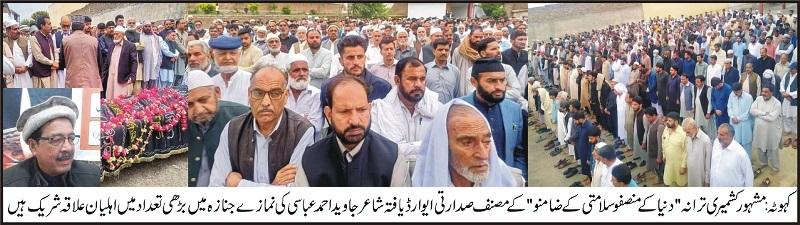 مشہور کشمیری ترانہ” دنیا کے منصفو سلامتی کے ضامنو “کے مصنف صدارتی ایوارڈ یافتہ شاعر جاوید احمد عباسی کو آہوں اور سسکیوں کے ساتھ سپرد خاک کر دیا گیا، نمازے جنازہ میں سیاسی، سماجی اور مذہبی شخصیات سمیت ہزاروں کی تعداد میں اہلیان علاقہ نے شرکت کی، مرحوم کی نمازے جنازہ میں سابق ایم این اے غلام مرتضیٰ ستی، ایم پی اے راجہ صغیر احمد،سابق ایم پی اے کرنل محمد شبیر اعوان، سابق ایم پی اے میجر لطاسب ستی،سابق امیدوار برائے ایم پی اے کرنل وسیم احمد جنجوعہ، معروف سیاسی وسیاسی وسماجی شخصیت عبد القدوس عباسی،معرو ف مسلم لیگی رہنماء ڈاکٹر محمد عارف قریشی،سرپر ست اعلیٰ پریس کلب کہوٹہ سعید افضل چوہا ن،صدر راجہ عمران ضمیر،نائب صدر راجہ شاہد اجمل، سیکرٹری اطلاعات ندیم چوہان، صحافی کبیر احمد جنجوعہ سمیت ہزاروں کی تعداد میں سیاسی وسماجی شخصیات نے شرکت کی۔