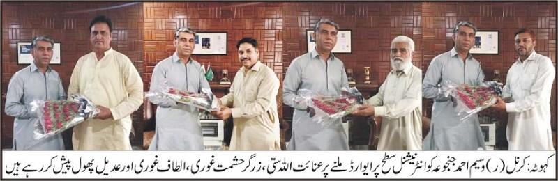 پاکستان تائیکوانڈو فیڈریشن کے صدر کرنل(ر) وسیم احمد جنجوعہ کوانٹر نیشنل سطح پر شاندار کارکر دگی پر ایوارڈ سے نوازہ گیا، اہلیان کہوٹہ اور کلر سیداں کی طرف سے مبارکباد، کہوٹہ کی سیاسی،سماجی اور تجارتی شخصیات نے گھر جا کر صدر پاکستان تائیکوانڈو فیڈریشن کرنل(ر) وسیم احمد جنجوعہ کو مبارکباد پیش کی،گذشتہ روز سابق چیئرمین زکوۃ عشر کمیٹی عنائت اللہ ستی، کہوٹہ کے معروف زرگر حشمت غوری،الطاف غوری، عدیل موتی بازار نے کرنل(ر) وسیم احمد جنجوعہ کے گھر جا کر ان سے ملاقات کی اور ان کو انٹر نیشنل سطح پر شاندار کارکر دگی پر ایوارڈ ملنے پر مبارکباد پیش کی انہوں نے چین کو شکست دے سپورٹس ایونٹ کو پاکستان لانے، ایشین تائیکوانڈو چیمپیئن شپ 54 کلو گرام کیٹیگری میں چاندی تمغہ اور برونز میڈل حاصل کرنے پر مبارکباد پیش کی اس موقع پر انہوں نے کہا کہ کرنل(ر) وسیم احمد جنجوعہ ہمارے کہوٹہ کی آن و شان ہیں انہوں نے عالمی سطح پر ملک اور علاقے کا نام روشن کیا ہے ہم ان کو شاندار الفاظ میں خراج تحسین پیش کرتے ہیں کرنل(ر) وسیم احمد جنجوعہ نے تمام معززین کا شکریہ ادا کیا۔