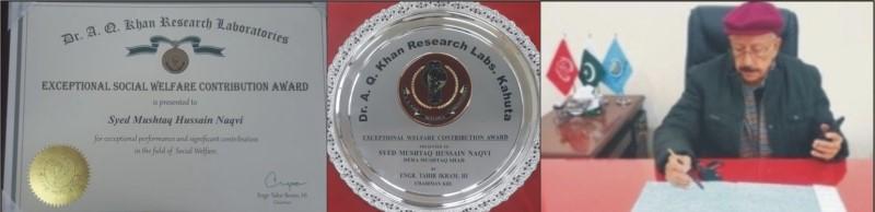 Agha Syed Mushtaq Naqvi was awarded a shield and a certificate of appreciation in recognition of his social work