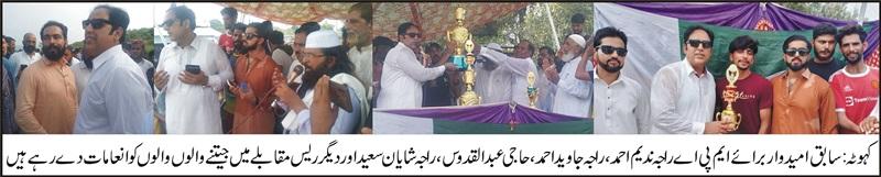 سابق امیدوار برائے ایم پی اے،سابق ناظم وچیئرمین راجہ ندیم احمد، راجہ سعید احمد اور راجہ علی اصغر کے زیر اہتمام5کلو میٹر پر محیط جشن آزادی ” ریس مقابلہ ”،1لاکھ50ہزار نقد اور ٹرافیاں انعامات،2سو سے زاہد نوجوانوں نے حصہ لیا، پہلی پوزیشن عبدالوہاب بھمبر آزاد کشمیر، دوسر ی پوزیشن اسرار محمد ڈھوک سیداں راولپنڈی، تیسری پوزیشن محمد رمضان سکوٹ نے حاصل کی۔تفصیل کے مطابق گذشتہ سالوں کی طرع اس سال بھی سداکمال تا سکوٹ سابق امیدوار برائے ایم پی اے،سابق ناظم وچیئرمین راجہ ندیم احمد، راجہ سعید احمد اور راجہ علی اصغر کے زیر اہتمام جشن آزادی ” ریس مقابلہ “کا انعقاد کیا گیا جس میں سینکڑوں تعداد میں نوجوانوں نے حصہ لیا جبکہ پانچ کلو میٹرکی اس ریس میں