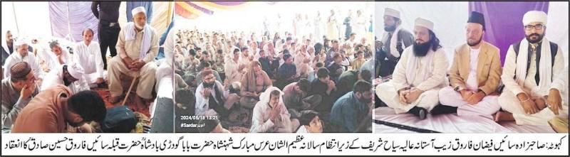 صدر انٹرنیشنل مشائخ کونسل برطانیہ صاحبزادہ سائیں فیضان فاروق زیب آستانہ عالیہ سیاح شریف کے زیر انتظام سالانہ عظیم الشان عرس مبارک شہنشاہ حضرت بابا گودڑی بادشاہ ؒحضرت قبلہ سائیں فاروق حسین صادق ؒکا انعقاد،بڑھی تعداد میں مذہبی، سیاسی و سماجی شخصیات کی شرکت، سائیں فاروق حسین صادق ؒ کے دربار شریف پر چادر چڑھائی گئی اور دعا کی گئی،تفصیل کے مطابق گذشتہ روز قبل آستانہ عالیہ نین سکھ سیاح شریف کوٹلی روڈ کشمیر ہاؤس کہوٹہ میں صدر انٹرنیشنل مشائخ کونسل برطانیہ صاحبزادہ سائیں فیضان فاروق زیب آستانہ عالیہ سیاح شریف، سائیں عمران فاروق حسین اورصاحبزادہ سائیں فیضان فاروق زیب آستانہ عالیہ سیاح شریف کے زیر اہتمام سالانہ عظیم الشان عرس مبارک شہنشاہ حضرت بابا گودڑی بادشاہ ؒحضرت قبلہ سائیں فاروق حسین صادق ؒکا انعقادکیا جس میں پیر طریقت رہبر شریعت ڈاکٹر پیر فضیل عیاض قاسمی، سجادہ نشین آستانہ عالیہ موھڑہ شریف مرکزی صدر اتحاد المشائخ پاکستان، ڈاکٹر صاحبزادہ ساجدالرحمن سجادہ نشین آستانہ عالیہ بگھار شریف، سردار بشیر پہلوان سابق مشیر حکومت آزاد کشمیر، چیئرمین راجہ شکیل احمد ضیاء ایڈوکیٹ سہنسہ، ممتاز سیاسی وسماجی شخصیت مظہر اقبال بھٹی ایڈووکیٹ، شہزادہ سیف الملوک، قدیر احمد بٹ، پروفیسر علامہ سردار اورنگزیب،علامہ قاری محمد شفیق، علامہ حافظ محمد بشارت، علامہ محمد جہانزیب، قیوم قادری، حافظ فہیم فدا، حافظ محمد کفیل ملنگی، حافظ افراز، خلیفہ صوفی محمد طارق یو کے اور دیگر علمائے کرام اور بہت بڑی تعداد میں عقیدت مندوں نے شرکت فرمائی اس موقع پر علمائے دین قرآن سنت کی روشنی میں اللہ کے نیک بندوں کے اوصاف بیان کیے آخر میں اجتماعی دعا کی گئی اورلنگر کے بعد دربار شریف پر چادر چڑھائی گئی۔