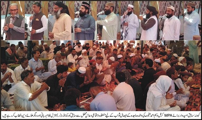 سابق امیدوار برائے ایم پی اے کرنل وسیم احمد جنجوعہ، نمبردار راجہ ندیم رشید، راجہ نویداحمد اور راجہ فہیم احمد کی والدہ ماجدہ کے ایصال ثواب کے لیے منعقدہ اجتماعی دعا