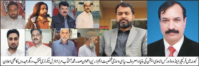 کہوٹہ میں فرنیچر اینڈ ووڈورکس ایسوسی ایشن کی بنیاد،معروف سیاسی وسماجی شخصیت ایم ذرین اعوان صدر،محمدآفتاب مرزا جنرل سیکرٹر ی منتخب،دیگر عہدوں کا بھی اعلان، مرکزی انجمن تاجران کہوٹہ و اہلیان علاقہ کہوٹہ کی طرف سے ایم ذرین اعوان اور دیگر تمام عہدیداروں کو مبارکباد،تفصیل کے مطابق گذشتہ روز قبل کہوٹہ شہر میں فرنیچر اینڈ ووڈورکس ایسوسی ایشن کی بنیادرکھی گئی جس میں باقاعدہ طور پر ایک باڈی تشکیل دی گئی جس میں کہوٹہ کی معروف سیاسی،سماجی و کاروباری شخصیت ایم ذرین اعوان کو صدر، راجہ شاہد محمو د نائب صدر،محمد آفتاب مرزاجنرل سیکرٹر ی،ناصر مرزا ڈپٹی جنرل سیکرٹری،حافظ امجد محمود خزانچی،راجہ افتخار ایگزیکٹیوکمیٹی،عمیر پرویز ایگزیکٹیوکمیٹی،زاہد عالم ایگزیکٹیوکمیٹی،کامران ظہور سیکرٹری اطلاعات اور حافظ عاصم آمین کو بھی سیکرٹری اطلاعات منتخب کیا گیا اس موقع پر پر صدر ایم ذرین اعوان نے مرکزی انجمن تاجران کہوٹہ اور اپنی یونین کے دیگر افراد کا شکر یہ ادا کیا اور کہا کہ انشاء اللہ جس اعتماد کا اظہار مجھ پر کیا ہے انشاء اللہ اس پر پورا اتروں گا۔