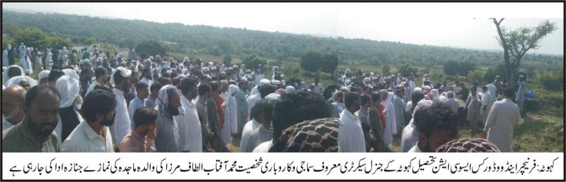 فرنیچر اینڈ ووڈورکس ایسوسی ایشن تحصیل کہوٹہ کے جنرل سیکرٹری معروف سماجی و کاروباری شخصیت محمد آفتاب الطاف مرزا،اکرام الطاف مرزا اور احتشام الطاف مرزا کی والدہ ماجدہ سپرد خاک نماز ے جنازہ میں بڑھی تعداد میں مذہبی، کاروباری، سیاسی وسماجی شخصیات کی شرکت