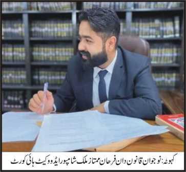 Farhan Mumtaz Malik Shampoor, a young lawyer, was congratulated by his friends, relatives and the people of the area for becoming an advocate of the High Court