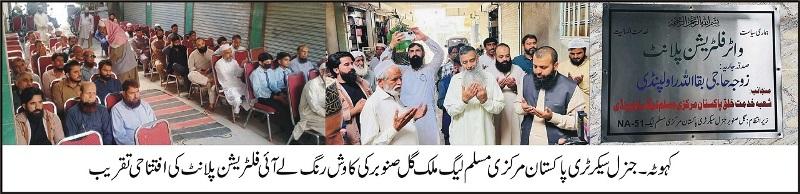 Kahuta (Pothwar.com, Kabir Ahmed Janjua, November 2, 2024) — The efforts of Pakistan Muslim League’s General Secretary, Gul Sanober Malik, have yielded positive results as a much-needed water filtration plant was inaugurated in Kahuta. The local community, as well as various political, social, and religious figures, gathered to commend Malik and his dedicated team for their contributions towards public welfare.
