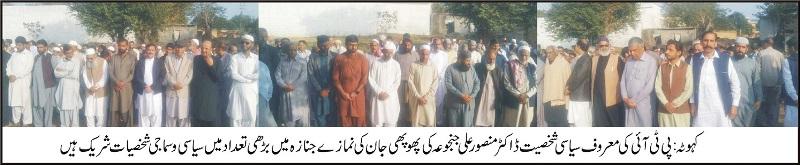 پی ٹی آئی کی معروف سیاسی شخصیت ڈاکٹر منصور علی جنجوعہ کی پھوپھی جان وفات پا گیں، نمازے جنازہ میں بڑھی تعداد میں سیاسی وسماجی شخصیات کی شرکت، مرحومہ کی نمازے جنازہ ان کے آبائی گاؤں بگلہ راجگان پاری پٹی یوسی مٹور میں ادا کیا گیا نمازے جنازہ معروف عالم دین مولانا اقبال قریشی نے پڑھائی جبکہ نمازے جنازہ میں پی ٹی آئی کی معروف سیاسی وسماجی شخصیت کرنل سعید جنجوعہ آف مٹور، کرنل ارشد جنجوعہ آف مٹور،صاحبزادہ ساہیں فیضان دربا رعالیہ سیاح شریف،معروف سیاسی وسماجی شخصیات ظفر اقبال کیانی،بابو راجہ ظفر اقبال، اویس کیانی،بلال کیانی،راجہ تبسم جنجوعہ،راجہ عمران جنجوعہ ممیام،کامران کیا نی آف بگلہ، شاہ جہان کیانی آف بگلہ،معروف صحافی انوار الحق راجہ، صحافی راجہ آصف محمود،پی ٹی آئی کے راجہ عاطف جنجوعہ ایڈووکیٹ،راجہ عبا س جنجوعہ مٹور،چیئرمین مرید اعوان ویلفیئر سوسائٹی ملک کلیم حسین اعوان، دربار عالیہ الطافیہ گیلانہ بکھر شریف اسلام آباد کے خادم نوجوان مذہبی شخصیت کبیر احمد قادری بکھر وری سمیت بڑھی تعداد میں سیاسی وسماجی شخصیات نے شرکت کی۔