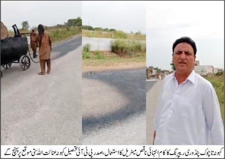 کہوٹہ تا چوک پنڈوری روڈ کی ناقص مرمت، صدر پی ٹی آئی تحصیل کہوٹہ عنائت اللہ ستی کا شدید احتجاج، کمیشن مافیا کو بے نقاب کرنے کا اعلان