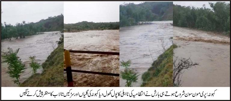 پری مون سون شروع ہوتے ہی بارش نے انتظامیہ کی نااہلی کا پول کھول دیا کہوٹہ کی گلیاں اور سڑکیں تالاب کا منظر پیش کرنے لگیں بارش کا پانی لوگوں کے گھروں، دکانوں اور مساجد میں داخل ہو گیا پری مون سون شروع ہوتے ہی مسلسل دو گھنٹوں کی بارش نے جہاں کہوٹہ کی سڑکوں کو تالاب بنا دیا وہی انتظامیہ کی نا اہلی اور نالوں پر تجاوزات کی وجہ سے پانی لوگوں کے گھروں، دوکانوں، اور مساجد می داخل ہو گیا نکاسی آب نہ ہونے کی وجہ سے جہاں ہلکی سی بارش میں بھی سڑکیں تالاب بن جاتی ہیں وہی پری مون سون کی بارش نے تاریخ کے ریکارڈ توڑ دیے کئی فٹ تک پانی سڑکوں پر بہنے لگا سڑکیں تالاب کا منظر پیش کرنے لگی سڑکوں پر کئیں فٹ تک پانی ہونے کی وجہ سے متعدد گاڑیاں بند ہونے کی وجہ سے دفاتر اور یونیورسٹیز جانے والوں کو شدید دشواری کا سامنا کرنا پڑا ہے اہلیان علاقہ نے اعلی حکام سے فلفور ہنگامی بنیادوں نکاسی آب کے لیے اقدامات کرنے کا مطالبہ کیا ہے۔