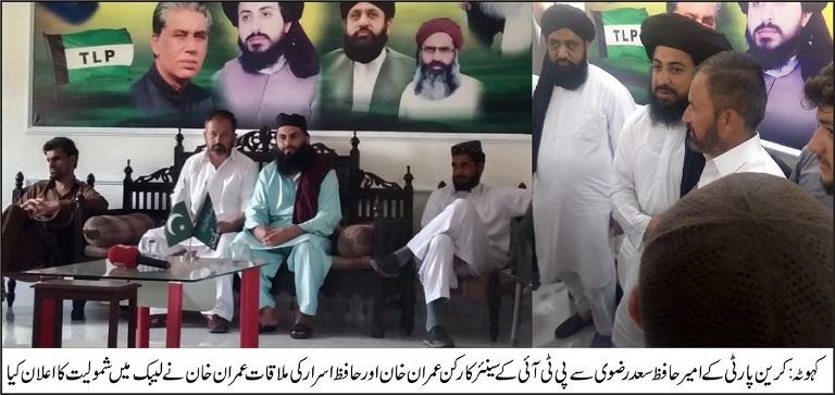 پی ٹی آئی تحصیل کہوٹہ کے سینئر کارکن عمران خان کی اپنے ساتھیوں سمیت پاکستان تحریک لبیک کے امیر حافظ سعد رضوی سے ملاقات،پی ٹی آئی کو چھوڑ کر پاکستان تحریک لبیک میں شمولیت کا اعلان