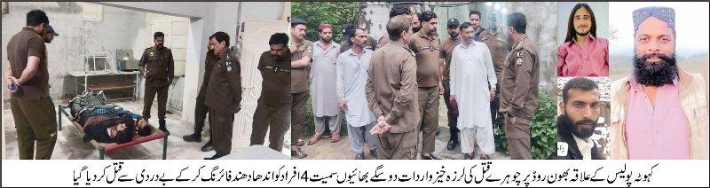 گذشتہ روز قبل کہوٹہ بھون روڑ پر4 افراد کے قتل کے الزام میں مقتول کے چاچا محمد یعقوب کی مدعیت میں تھانہ کہوٹہ میں 5 نامزد اور 9 نا معلوم افراد کے خلاف زیر دفعہ،302،341،427،148،149 کے تحت مقدمہ درج۔ تفصیلات کے مطابق علیوٹ کے رہائشی عمر اقبال، مدثر اقبال، جنید گل، متین کیانی اور شعیب گزشتہ شب محمد یعقوب کے گھر آئے تھے۔ محمد یعقوب کے مطابق اس کا بھتیجا ثمر اقبال اپنے ساتھیوں سمیت کسی کام کے سلسلے میں نکلا اور کہا کہ واپس آجائے گا، لیکن واپسی نہ ہونے پر وہ مدثر اقبال اور لیاقت حسین کے ہمراہ بھون روڈ کی طرف روانہ ہوا۔ محمد یعقوب کے مطابق ویگو ڈالہ جس میں ثمر اور اس کے ساتھی سوار تھے، سامنے سے آرہا تھا کہ اچانک فیکری نما پہاڑی اور جھاڑیوں میں چھپے ملزمان جن میں شیر بہادر، حافظ رستم، خان جابر، مبین، سبحان اور آٹھ سے نو نا معلوم مسلح افراد شامل تھے، نمودار ہوئے اور اندھادھند فائرنگ شروع کر دی۔ حملے کے نتیجے میں ثمر اقبال، جنید گل، متین کیانی اور شعیب شدید زخمی ہو گئے۔ ملزمان نے ویگو ڈالے سے زخمیوں کو باہر نکالا اور زمین پر گرا کر دوبارہ فائرنگ کی۔ محمد یعقوب کے مطابق شیر بہادر نے موقع پر تمام زخمیوں کو چیک کیا اور موت کی تصدیق کے بعد ملزمان فرار ہو گئے۔ پولیس تھا نہ کہوٹہ نے واقعے کا مقدمہ درج کر کے تفتیش کا آغاز کر دیا ہے جبکہ علاقے میں خوف وہر اس کی فضا قائم ہے۔ پولیس کے مطابق جلد ملزمان کی گرفتاری کے لیے کارروائی کی جائے گی۔