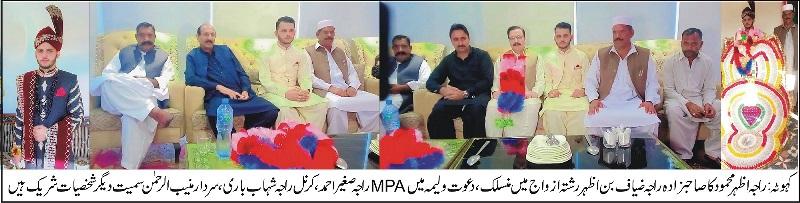موضع عثمان پور یوسی ہوتھلہ کی معروف سیاسی وسماجی شخصیت راجہ اظہر محمود کا صاحبزادہ راجہ ضیاف بن اظہر رشتہ ازواج میں منسلک،دعوت ولیمہ میں ایم پی اے راجہ صغیر احمد سمیت سیاسی وسماجی شخصیات کی شرکت، راجہ اظہر محمودکے صاحبزادہ راجہ ضیاف بن اظہرکی دعوت ولیمہ کی پروقار تقریب اعجاز میرج ہال ترکھیاں میں منعقدہو ا دعوت ولیمہ کی پروقار تقریب میں مسلم لیگ ن کے ایم پی اے راجہ صغیر احمد،معروف سیاسی وسماجی شخصیت سردار منیب الرحمن،راجہ ندیم احمد آف جباں،کرنل راجہ شہاب باری،کونسلر حاجی راجہ غلام فرید، راجہ مبارک، راجہ نصیر ہر دو گہر،راجہ سفیر ہر دو گہر،راجہ سجاد پنڈ ملکاں،راجہ جمال، راجہ بلال مورگاہ، سردار مہتاب مانسہرہ،حاجی راشد محمود مانسہرہ،بابو محمد حنیف،راجہ محمد آزاد آف گرمالہ،الیاس کیانی آف جبی گگھڑاں،نثار کیانی آف جبی گگھڑاں،راجہ ظفر محمود آف جبی گگھڑاں،چوہدری سرور آف سیالکوٹ،راشد قریشی،راجہ محمد سعید کیانی سہیالہ سمیت بڑی تعداد میں سیاسی وسماجی شخصیات نے شرکت کی،تقریب کے میزبان معروف سیاسی وسماجی شخصیت راجہ اظہر محمود نے تمام معزز مہمانوں کی تواضع پر تکلف کھانوں کے ساتھ کی اور مہمانوں کی تشریف آوری پر ان کا شکریہ بھی ادا کیا۔