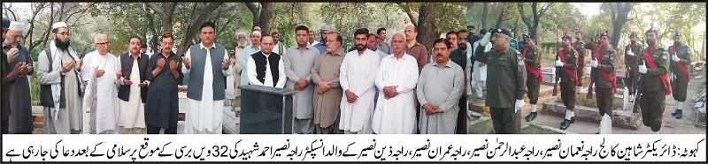 The annual prayer ceremony for Inspector Raja Naseer Ahmad Shaheed and his late wife was held at the shrine of Sakhhi Sabzwari. Inspector Raja Naseer Ahmad Shaheed, father of Raja Nauman Naseer (Director Shaheen College) and Raja Abdur Rehman Naseer, Raja Imran Naseer, and Raja Zain Naseer, embraced martyrdom on October 28, 1993, during an encounter with criminals.