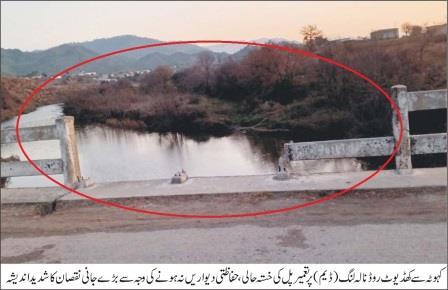 کہوٹہ سے کھڈیوٹ روڈ نالہ لنگ (ڈیم) پرتعمیر پل کی خستہ حالی،حفاظتی دیواریں نہ ہونے کی وجہ سے بڑے جانی نقصان کا شدید اندیشہ،کمشنر راولپنڈی، ڈی سی راولپنڈی اور اے سی کہوٹہ سے فلفور از خود نوٹس لینے کی اپیل،تفصیل کے مطابق کہوٹہ سے کھڈیوٹ روڈ جو لہتراڑ،کوٹلی ستیاں، مری جاتی ہے راستے میں نالہ لنگ (ڈیم) پرتعمیر پل کی حالت انتہائی خستہ حالت میں ہے پل کی دونوں سائیڈوں پر حفاظتی دیواریں نہ ہو نے کی وجہ سے سکول آتے جاتے بچوں، بچیوں اور دیگر رائیگروں کے گرنے کا اندیشہ ہے عوام علاقہ نے کہا کہ ہم نے کئی بار معززین علاقہ اور ممبران اسمبلی کو اس مسلے کی طرف توجہ دیلائی ہے مگر کوئی بھی ٹس سے مس نہیں ہے اور اگر خدانخواستہ کوئی حادثہ ہو گیا تو سب فوٹو بنانے وہاں پر پہنچ آہیں گے عوام علاقہ نے کمشنر راولپنڈی، ڈی سی راولپنڈی اور اے سی کہوٹہ سے فلفور از خود نوٹس لینے کی اپیل کی ہے۔
