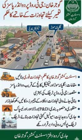 گوجرخان; جی ٹی روڈ پر دو انڈر پاسز کی تعمیر کیلئے تجاوزات کے خلاف آپریشن شروع کرنے کی ہدایت