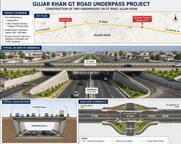 Gujar Khan (Pothwar.com / April 27, 2026): In a significant move to address growing traffic challenges, authorities have initiated the construction of two major underpasses along the busy Grand Trunk (GT) Road in Gujar Khan. The project is being seen as a crucial step toward improving traffic flow and reducing accidents in the area.